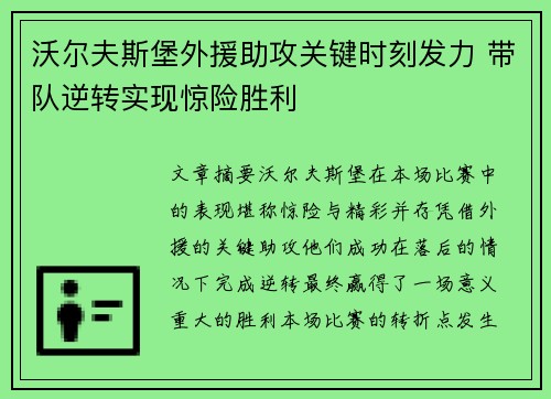 • 沃尔夫斯堡外援助攻关键时刻发力 带队逆转实现惊险胜利