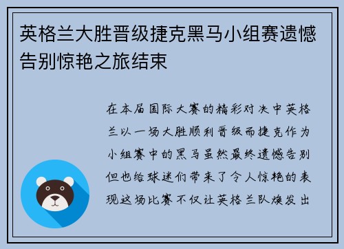 在本届国际大赛的精彩对决中,英格兰以一场大胜顺利晋级,而捷克作为小组赛中的黑马,虽然最终遗憾告别,但也给球迷们带来了令人惊艳的表现。这场比赛不仅让英格兰队焕发出强大的实力,也为捷克队的奋斗精神和潜力留...