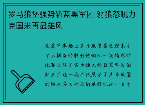 在意甲赛场上,罗马狼堡最近迎来了令人振奋的胜利,他们以一场精彩的比赛击败了实力强大的蓝黑军团国际米兰。这一战,不仅展示了罗马狼堡的强大实力,也让“豺狼怒吼”这一名号再度响彻赛场。此役过后,罗马狼堡的雄...