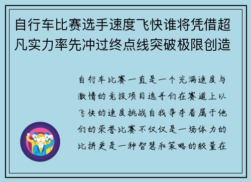 自行车比赛一直是一个充满速度与激情的竞技项目,选手们在赛道上以飞快的速度挑战自我,争夺着属于他们的荣誉。比赛不仅仅是一场体力的比拼,更是一种智慧和策略的较量。在这个过程中,选手们凭借卓越的骑行技巧和过...