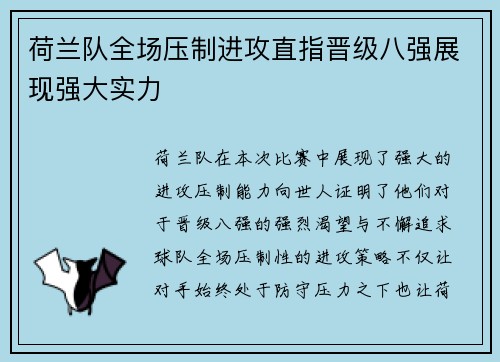 荷兰队在本次比赛中展现了强大的进攻压制能力,向世人证明了他们对于晋级八强的强烈渴望与不懈追求。球队全场压制性的进攻策略,不仅让对手始终处于防守压力之下,也让荷兰队的实力得到了充分展现。从前场高压逼抢到...