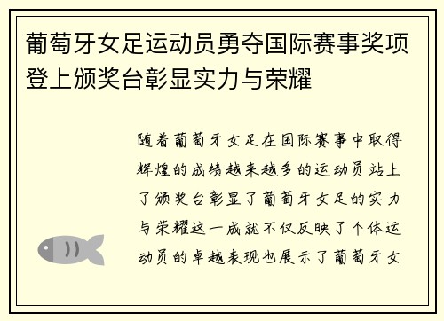 随着葡萄牙女足在国际赛事中取得辉煌的成绩,越来越多的运动员站上了颁奖台,彰显了葡萄牙女足的实力与荣耀。这一成就不仅反映了个体运动员的卓越表现,也展示了葡萄牙女足在国际足坛的崛起和影响力。通过她们在赛事...