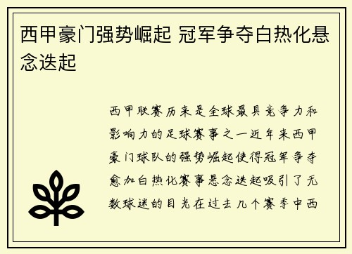 西甲联赛历来是全球最具竞争力和影响力的足球赛事之一,近年来,西甲豪门球队的强势崛起,使得冠军争夺愈加白热化,赛事悬念迭起,吸引了无数球迷的目光。在过去几个赛季中,西甲的格局发生了显著变化,尤其是传统豪...