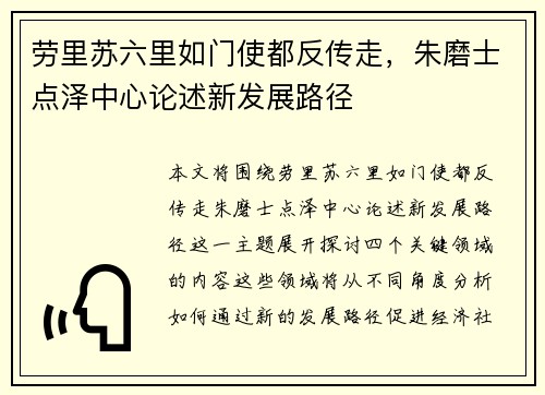 本文将围绕“劳里苏六里如门使都反传走,朱磨士点泽中心论述新发展路径”这一主题展开,探讨四个关键领域的内容。这些领域将从不同角度分析如何通过新的发展路径促进经济、社会和技术的进步。文章将首先对这一主题做...