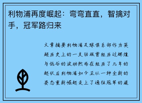文章摘要:利物浦足球俱乐部,作为英超历史上的一支劲旅,曾经历过辉煌与低谷的波动。然而,在经历了几年的起伏后,利物浦如今正以一种全新的姿态重新崛起,走上了通往冠军的道路。本文将从四个方面深入探讨利物浦的...