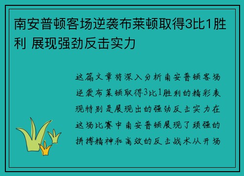 这篇文章将深入分析南安普顿客场逆袭布莱顿取得3比1胜利的精彩表现,特别是展现出的强劲反击实力。在这场比赛中,南安普顿展现了顽强的拼搏精神和高效的反击战术,从开场时的被动局面,到逐步掌控比赛节奏,最终以...