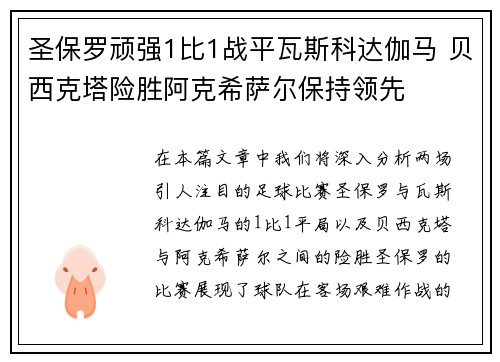 在本篇文章中,我们将深入分析两场引人注目的足球比赛——圣保罗与瓦斯科达伽马的1比1平局,以及贝西克塔与阿克希萨尔之间的险胜。圣保罗的比赛展现了球队在客场艰难作战的精神,而贝西克塔则以其强大的攻防能力成...
