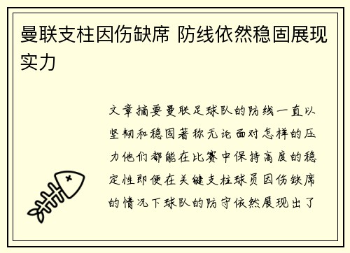 文章摘要:曼联足球队的防线一直以坚韧和稳固著称,无论面对怎样的压力,他们都能在比赛中保持高度的稳定性。即便在关键支柱球员因伤缺席的情况下,球队的防守依然展现出了强大的实力。这不仅是球队在人员调整上的成...