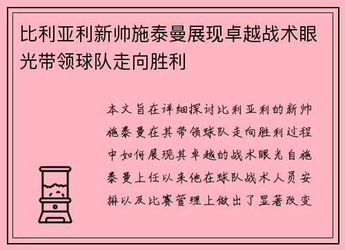 本文旨在详细探讨比利亚利的新帅施泰曼在其带领球队走向胜利过程中,如何展现其卓越的战术眼光。自施泰曼上任以来,他在球队战术、人员安排以及比赛管理上做出了显著改变,使得比利亚利在短时间内焕发了新的生机。通...