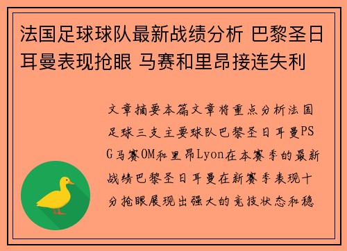 文章摘要:本篇文章将重点分析法国足球三支主要球队——巴黎圣日耳曼(PSG)、马赛(OM)和里昂(Lyon)在本赛季的最新战绩。巴黎圣日耳曼在新赛季表现十分抢眼,展现出强大的竞技状态和稳定的战绩,而马赛...