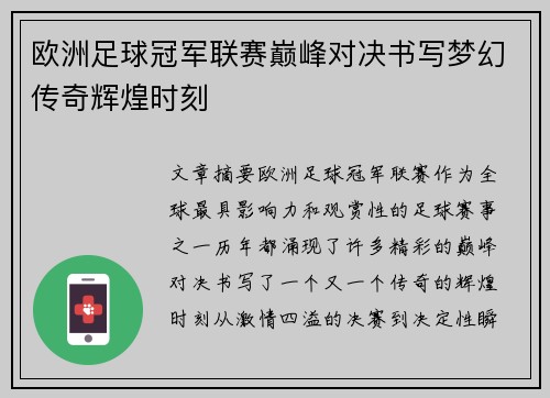 文章摘要:欧洲足球冠军联赛,作为全球最具影响力和观赏性的足球赛事之一,历年都涌现了许多精彩的巅峰对决,书写了一个又一个传奇的辉煌时刻。从激情四溢的决赛到决定性瞬间的高潮,每一场比赛都铭刻着历史的印记,...