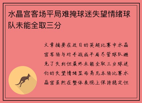 文章摘要:在近日的英超比赛中,水晶宫客场与对手战成平局,尽管球队避免了失利,但最终未能全取三分,球迷们的失望情绪显而易见。本场比赛,水晶宫虽然在整体表现上保持稳定,但在关键时刻未能把握住机会,未能将比...