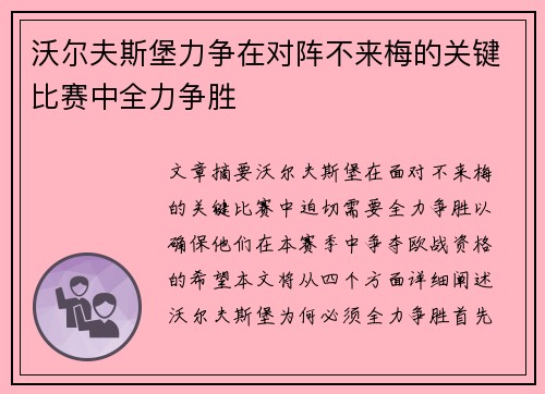 文章摘要:沃尔夫斯堡在面对不来梅的关键比赛中,迫切需要全力争胜,以确保他们在本赛季中争夺欧战资格的希望。本文将从四个方面详细阐述沃尔夫斯堡为何必须全力争胜。首先,球队的当前状态决定了他们需要在对阵不来...
