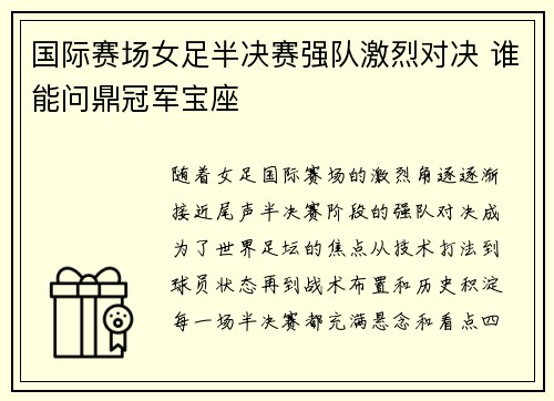 随着女足国际赛场的激烈角逐逐渐接近尾声,半决赛阶段的强队对决成为了世界足坛的焦点。从技术打法到球员状态,再到战术布置和历史积淀,每一场半决赛都充满悬念和看点。四支强队在这场关键较量中展开较量,力争最终...